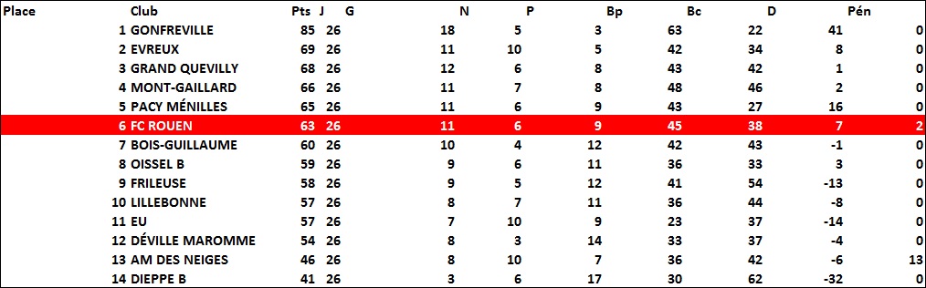 Les Diables Rouges ne seront jamais en mesure de batailler pour la montée à cause de résultats inconstants, alors que dans le même temps, Gonfreville domine le championnat de la tête et des épaules jusqu’à être sacré champion.